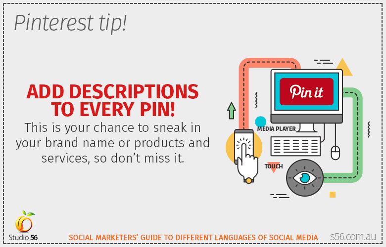 - Add descriptions to every pin: this is your chance to sneak in your brand name or products and services, so don’t miss it. Explain what’s on the image or link you’re pinning and make sure it’s conversational and not stuffed with keywords.