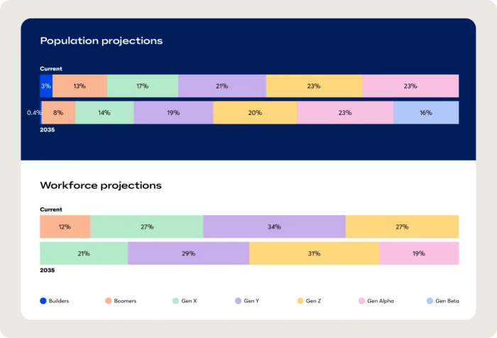 McCrindle predicts that Gen Beta won’t start making a dent in the global population until 2035, when it’s estimated to comprise 16%. As for the global workforce population, that’s to come much later, as Gen Z is expected to remain the dominant group and millennials (or Gen Y) at a close second (31% vs. 29%, respectively).