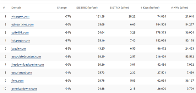 Panda made the bigger splash, affecting close to 12% of all search queries. Two weeks after Panda's rollout, SEO analytics platform SISTRIX conducted a study that found the biggest losers suffered a search visibility drop of up to 94%. (2)