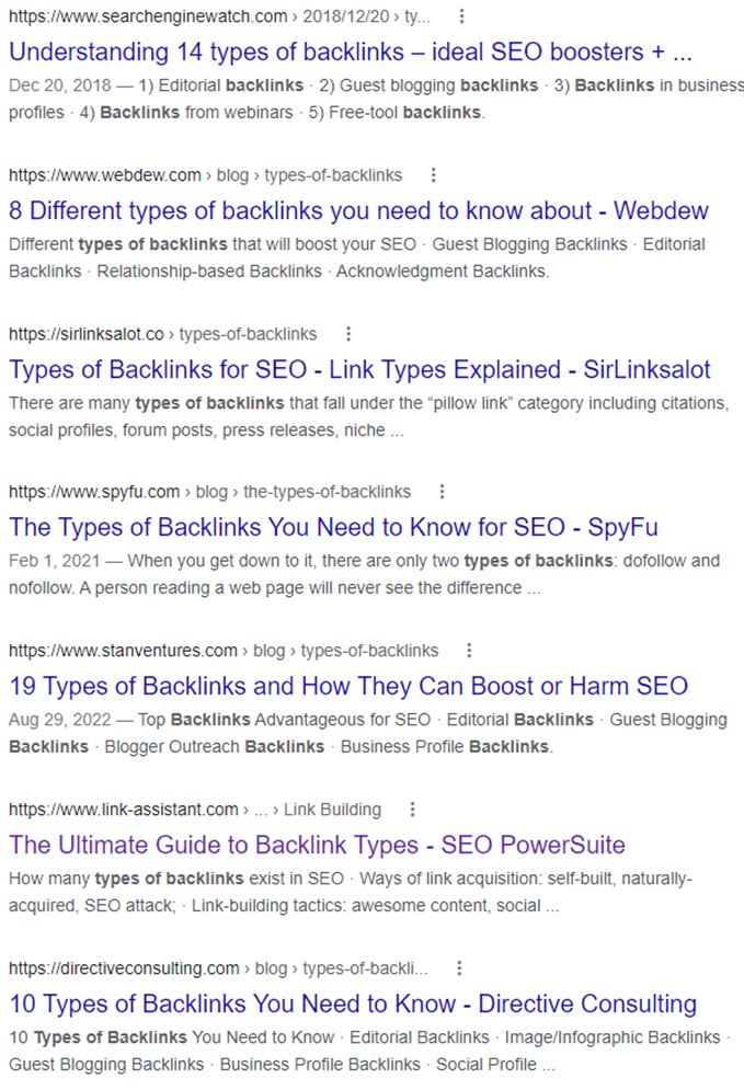 There are probably a hundred backlink types for all we know, including good and bad ones. However, not every type is required in a business’s SEO link building strategy. Most of these first-page results agree on the best type of backlinks, which are: