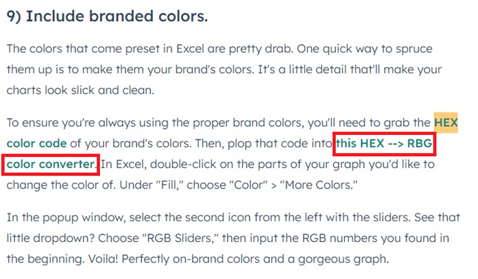 Here’s an example: The excerpt below is from a Hubspot blog post on designing beautiful Excel charts. The anchor text in the red boxes links to NO-BS’s Colour Converter Tool.