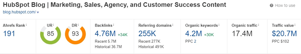 The anchor text may not link to a blog post, but this example proves that Hubspot found the tool useful. Even better, it’s from a domain with an impressive rating across the board, as far as Ahrefs Site Explorer statistics are concerned.