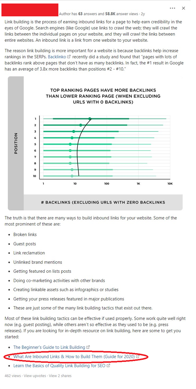 When used correctly, however, comment backlinks can be valuable. One viable approach is to answer industry-relevant questions on sites like Quora. In the example below, an industry expert for a link building firm answers a user’s question on what link building is in detail and provides a link to the firm’s blog post at the bottom.