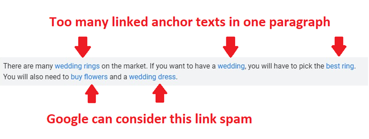 Besides buying and selling links, Google penalises over-optimised anchor texts in guest posts and distributed press releases. Google provides an example below.