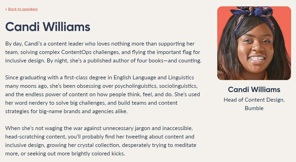 Emphasis on ‘sometimes,’ as not all opportunities result in acknowledgment backlinks. The example below is from a content strategy conference scheduled for next year. Notice the lack of backlinks in the profile.