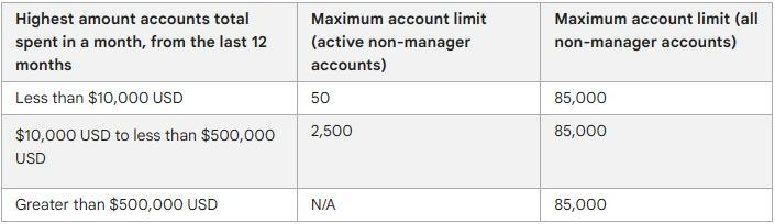 However, inactive accounts count to the absolute limit of 85,000, regardless of spending. As such, you’ll have to remove them to open up slots for new ones. An MCC account that fluctuates between spending brackets can still keep any excess accounts but won’t be able to link additional ones.