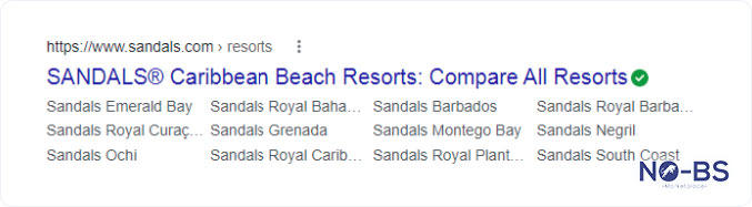 We’ll start with a search for ‘sandals resort locations.’ The rich snippet below shows a list of Sandals beach resort locations within the description of the search result. This is an example of a rich snippet that has been customised to list location information using schema markup.