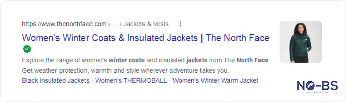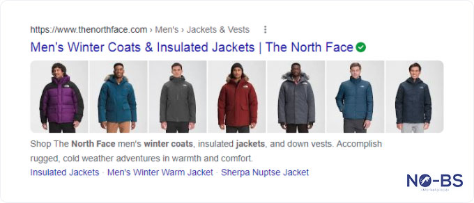 The search result includes a description of the women’s coats, a product photo, and 3 relevant links within The North Face website. This kind of search result is attractive to searchers because it gives details and options that appeal to their search intent. Here’s another example from The North Face.