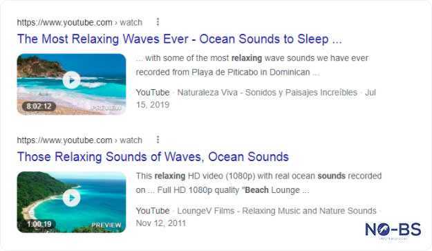 While most search results follow the same text forward template, a search result for a video using video schema markup stands out. Check out this example of how videos are displayed in this search for ‘soothing beach sounds.’