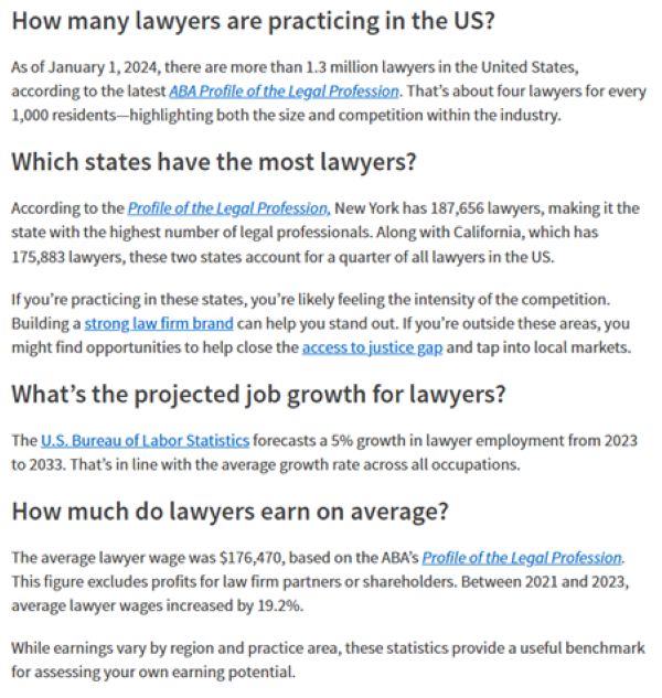 You can allot space for a list of references at the bottom of the content or, as the Clio blog post below shows, provide a link for each data point. Not every fact needs to be linked to a source, though it’s a must for claims and figures. This way, you can avoid getting in trouble, if not in legal hot water, for making potentially misleading claims.