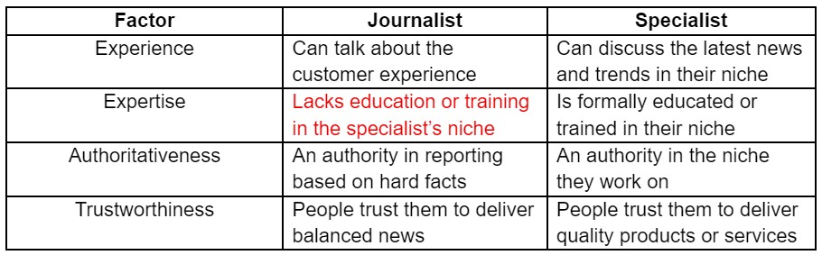 It gets better. A journalist can’t claim to be an expert in any niche or profession, relying on specialists in the field for facts. As such, expertise and authoritativeness—two of the E-E-A-T factors—are follow-ons to demonstrating firsthand experience.