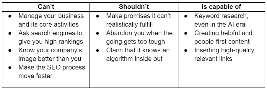 With outsourcing SEO being favored even by large companies, it’s only fitting that you get a no-BS picture of an SEO firm’s duties. Starting with what it can’t and shouldn’t do.