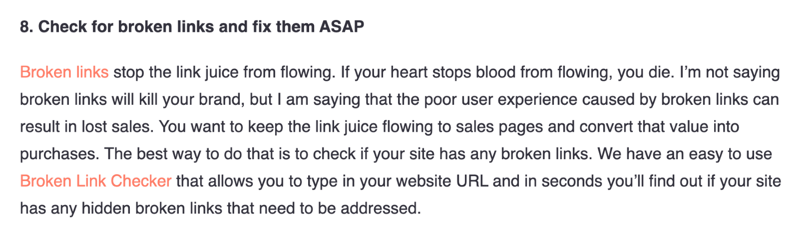 Having a link that adds no value to the source content can lead to poor user experience and high bounce rates. This results in Google viewing them as spammy which can potentially hurt your SEO efforts. If you have links that are not passing down the value, cut them out. On the other hand, links that provide more value can help pass authority down and create a consistent flow from one page to another.
