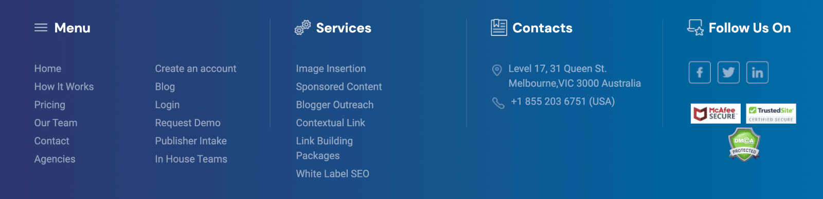- Footer links: Footer links, a critical part of website navigation, serve the same purpose as menu links for guiding users and aiding visitors to backtrack to important pages quickly.