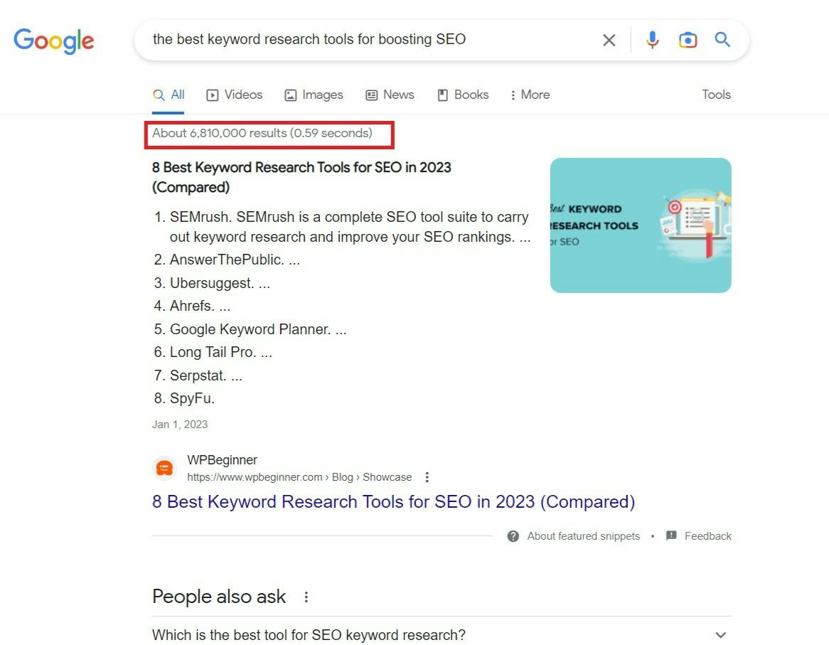 Picking up from the example above, we added a few words to the phrase and put ourselves in the shoes of a marketer’s looking for keyword research tools. Hence, we ended up with ‘the best keyword research tools for boosting SEO' and saw results exponentially dropping to 6.81 million.