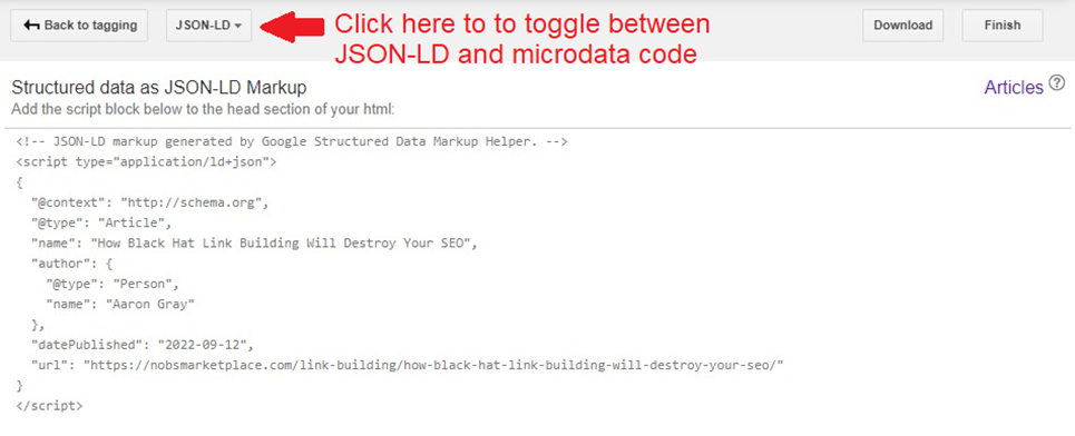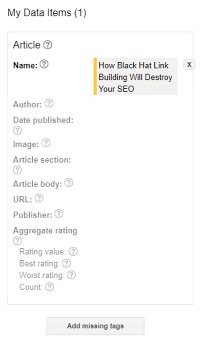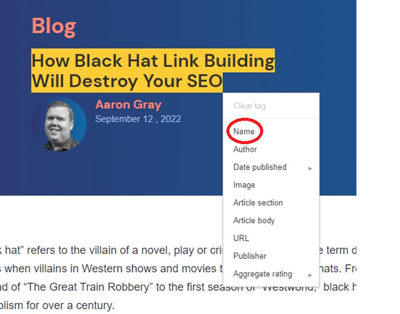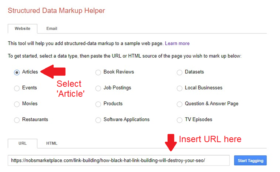 Coding knowledge is a welcome bonus, but Google’s Structured Data Markup Helper tool makes applying Schema to pages easier. In this section, we’ll use the tool to help another of our blog posts, ‘How Black Hat Link Building Will Destroy Your SEO,’ receive the Schema treatment.