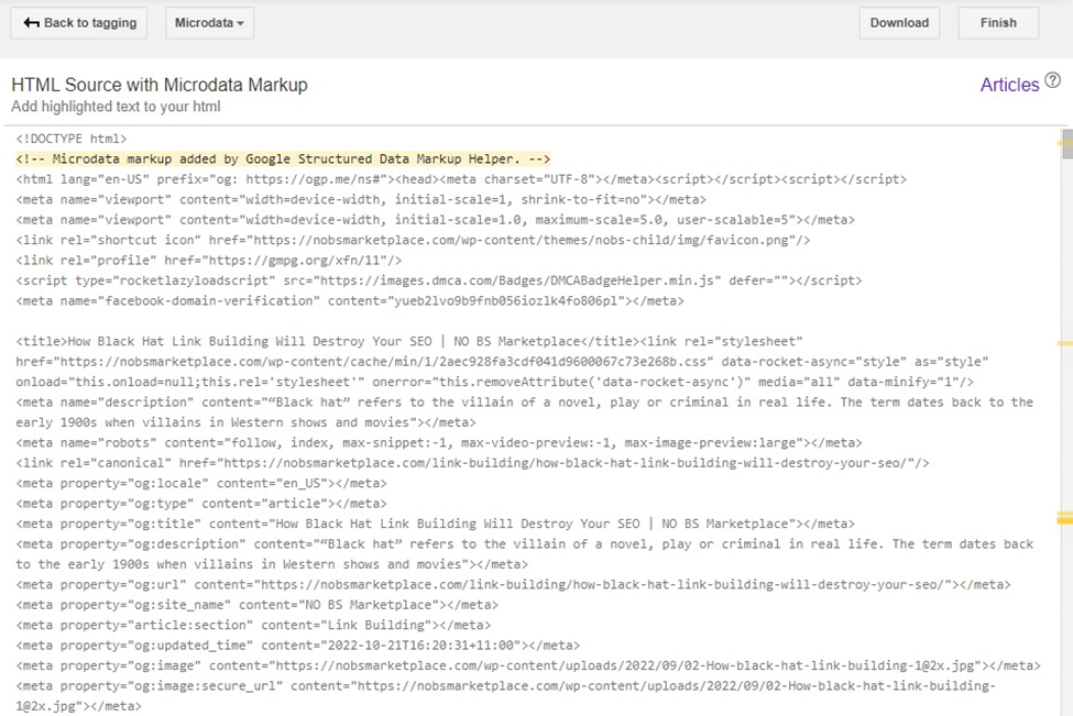 - 5. Download the markup and incorporate it into the page’s code. In addition, click ‘Finish’ to know the next steps which include searching for more data tags and testing the code. Schema.org suggests placing as many markups as possible to get the best possible result, though only on data users can generally see.