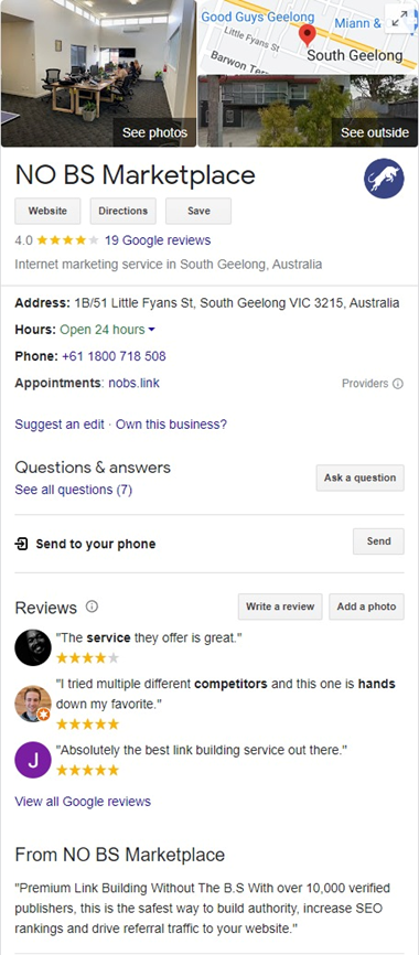 When a user searches for a person, a place, or an object, Google produces knowledge panels on the right side of the search results. In Google’s words, these panels yield ‘a quick snapshot‘ of relevant information based on how the search engine understood the query. For example, if you search for NO-BS Marketplace, you get this: