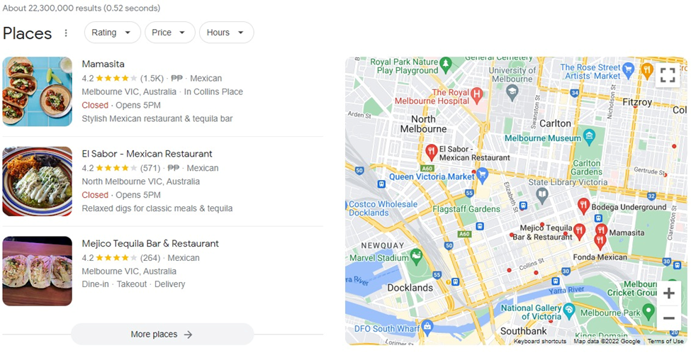 For businesses that deal with appointments or advanced orders, Google has the local business schema to help people locate them quickly. For example, searching for ‘Mexican restaurant Melbourne’ generates the following result: