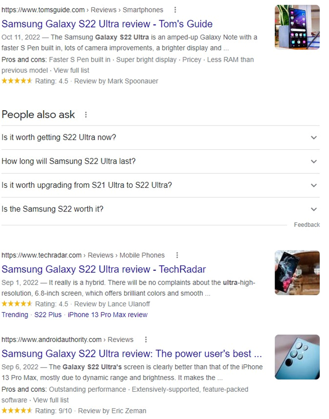 The rating data on each result is a big help to people looking to, in this context, buy a new smartphone. The snippet listing the phone’s pros and cons adds to the information’s value. Together, they lessen the time people will need to come to a decision