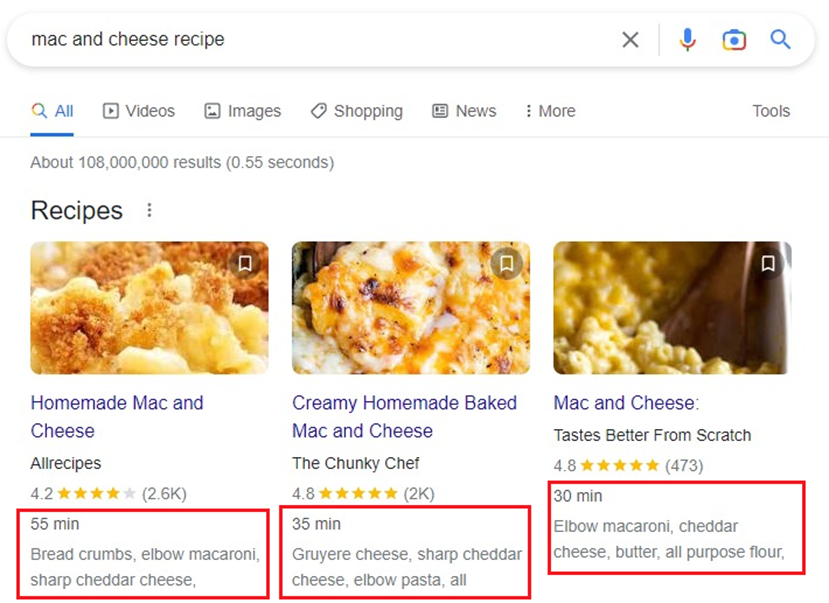 To be accurate, this is the product of Schema, a system that allows search engines like Google to comprehend information in search results. In the example above, the search query for ‘mac and cheese recipe’ yielded these recipes at the top of the results page. Google understood this because of how the information in the red boxes appeared, as in a list of ingredients.