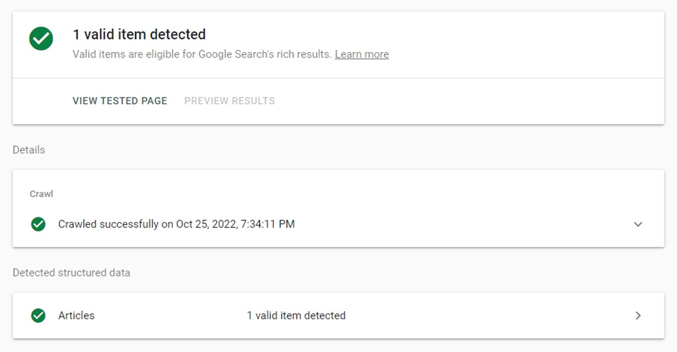 To determine if a page can generate these snippets, you can run its URL through Google’s Rich Results Test. We ran one of our earlier blog posts, ‘What is Tactical Link Building,’ through the tool and weren’t disappointed with the results.