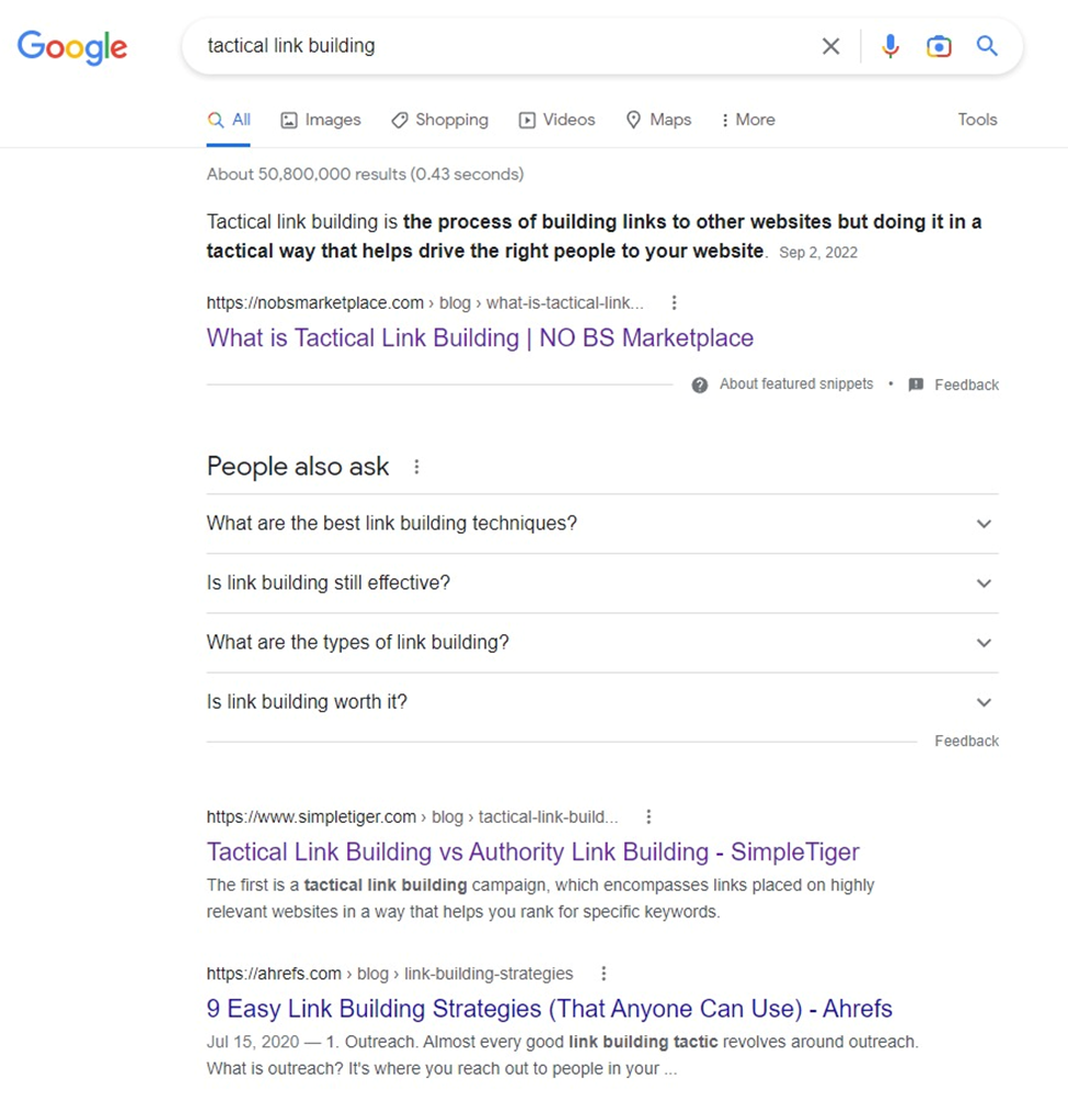 Here’s how the blog post appeared when searching for ‘tactical link building.’