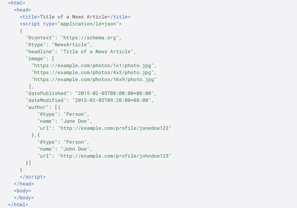 JSON-LD is the latest version of the lightweight and easy-to-use JSON format. The addition of linked data allows pages to be interconnected, starting at one data point and following it to other networked data points. Below is what a JSON-LD code looks like in adding article-type structured data, according to the Google Developers site.