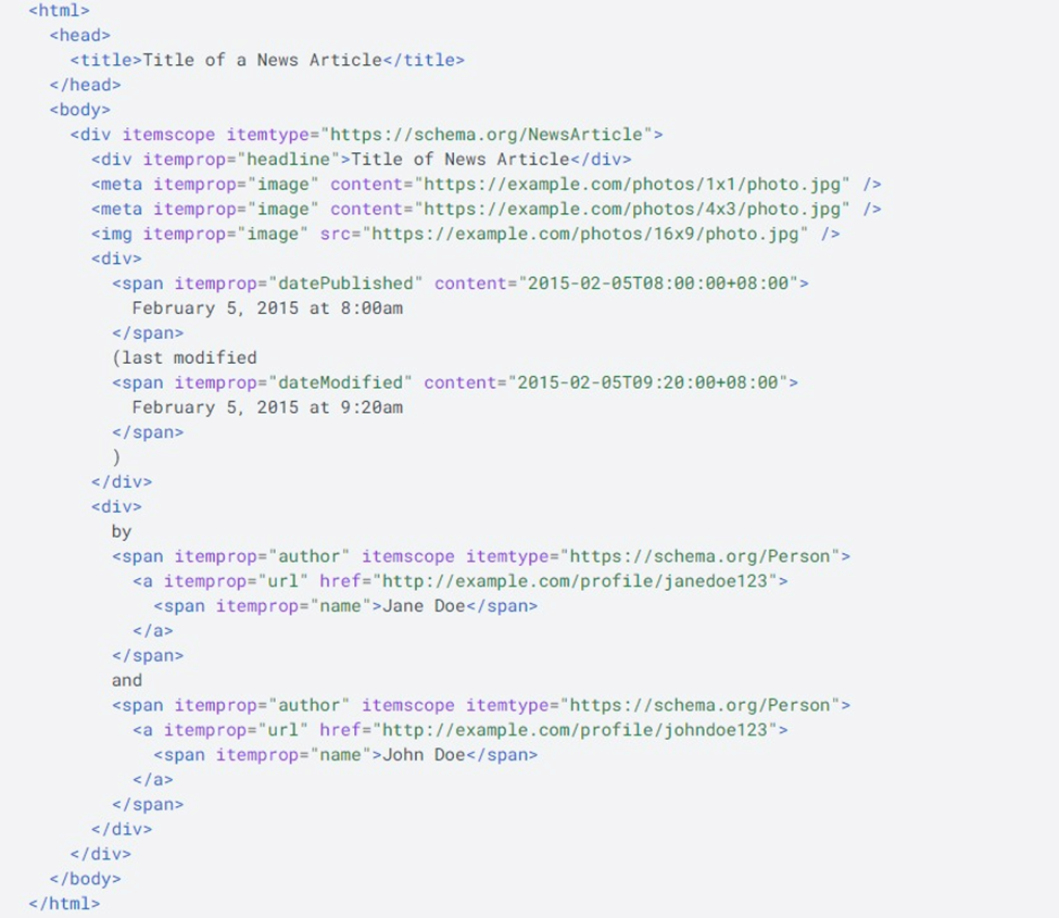 Microdata is an HTML-based code that creates a richer snippet experience by visually styling a page’s elements. Here’s an example of a microdata code for adding article-type structured data, again from the Google Developers site.