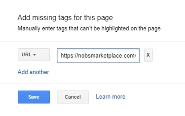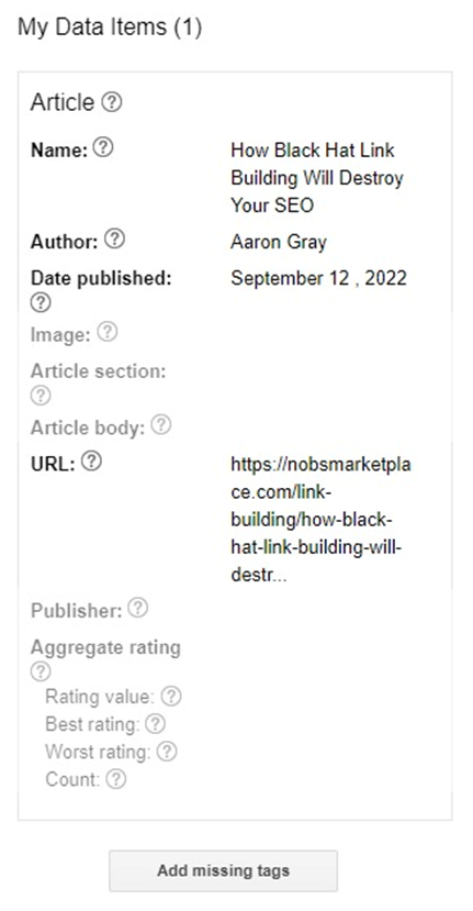 - Note that you can manually add data by clicking ‘Add Missing Tags.’ We did just that for the blog post’s URL.