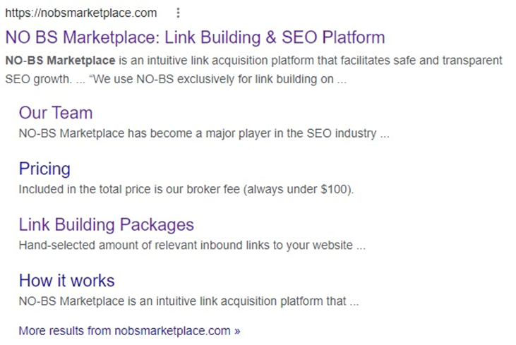 Instead of the visitor having to make their way to the destination page, Google shortens the trip with a sitelink schema. NO-BS’s sitelink result on the search results looks like this: