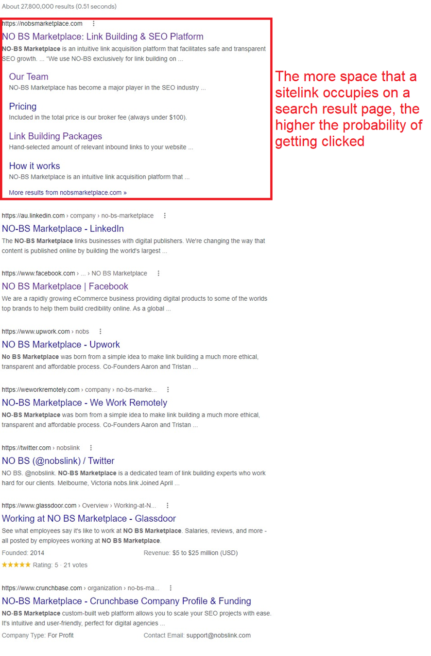 But perhaps the more important advantage is the space it occupies on the search results page. Typically, Google lists 10 results per page. With a sitelink schema, the number of results on the first page is down to eight since the NO-BS sitelink occupies 20% of the results.