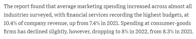 According to a marketing budgets report by The Wall Street Journal’s Megah Graham, the average marketing spend in 2022 was 9.5%. Of course, this varies with the industry and the total revenue generated by a company. Here is an excerpt of the report: