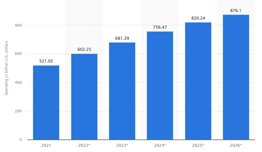 This explains the increase in global annual digital marketing spend over the last decade. The total amount spent on this department was AUD$813 billion in 2021, up from AUD$512 billion the previous year. It’s expected to hit as high as over AUD$1.3 trillion by 2026. Here are the projections between 2022 and 2026: