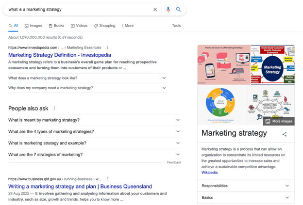 For example, here's what appears on my search engine after typing a query about marketing strategy. There were over 900,000 results, with the definition of the term ranking at the top of the page.