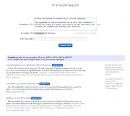 This content – a description taken from our website – has come back with a match, as Copyscape recognises it’s already published online. This means the content is plagiarised and could hurt your ranking.