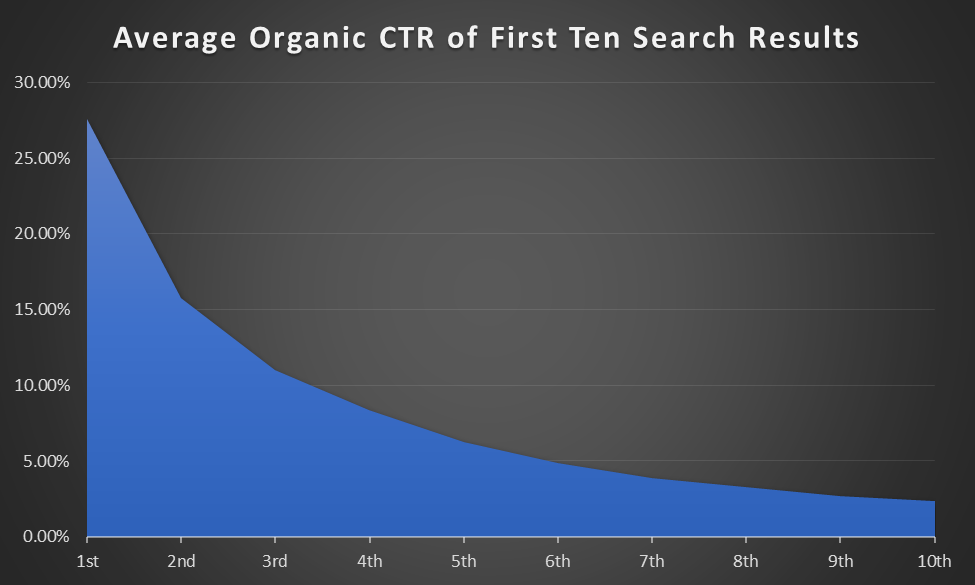 Below is an estimation of the click-through rate (CTR) of the first 10 search results. The CTR refers to how many clicks a specific ad receives relative to the number of impressions or times people saw the ad. Unsurprisingly, the first result gets over a quarter of the clicks. The first three results receive more clicks than the remaining seven combined.