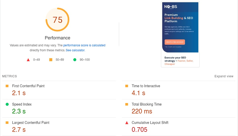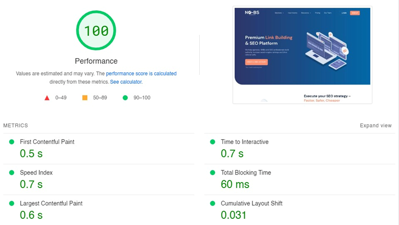 You can check your website’s loading speed through online tools like Google’s PageSpeed Insights. Enter the URL, and it’ll generate a detailed report of the site’s loading speed. The following are the results for NO-BS Marketplace’s desktop website.