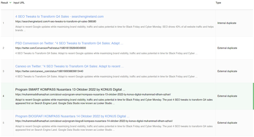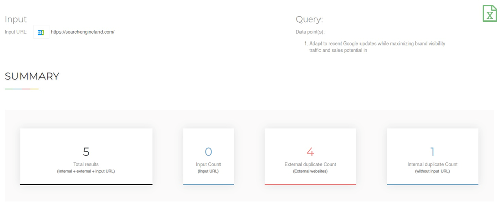 Fortunately, checking a site for duplicate content doesn’t have to feel like finding a needle in a haystack. Tools like Duplicate Content Checker from SEOreviewtools lets you narrow down the results. For example, here’s the result for Search Engine Land.