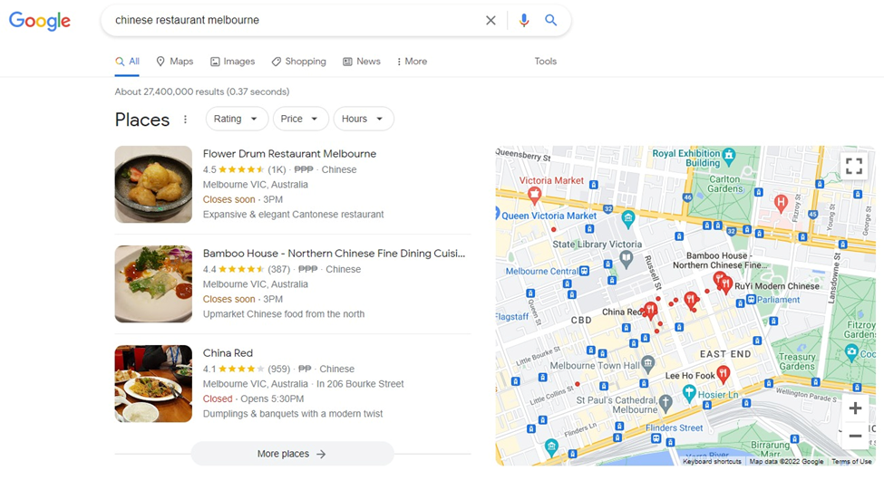 The box on the right is an example of a GBP. It’s a service that greatly helps businesses rank in SERPs, particularly in local search. People will search for a product or service close to them, so they tend to enter geotagged queries like ‘Chinese restaurant Melbourne.’