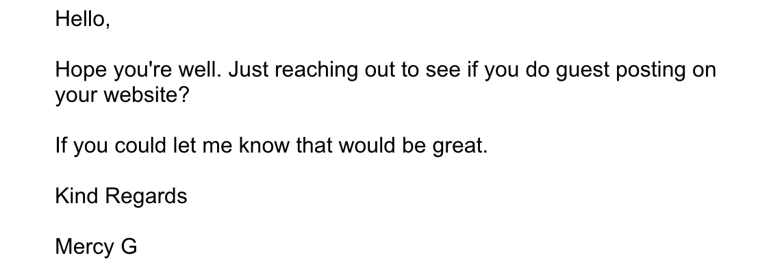 - Approach publishers directly: You can also choose to contact relevant publishers to have them add your website link to their content. One way to find potential publishers is through your competitors’ link profiles. After you’ve curated your competitors’ link profiles, you can use a backlink tool to check and dissect this information. You can also check online to find relevant local websites with high domain authorities. With your list ready, write a personalized link-building pitch and send it to each publisher. Here’s an example: