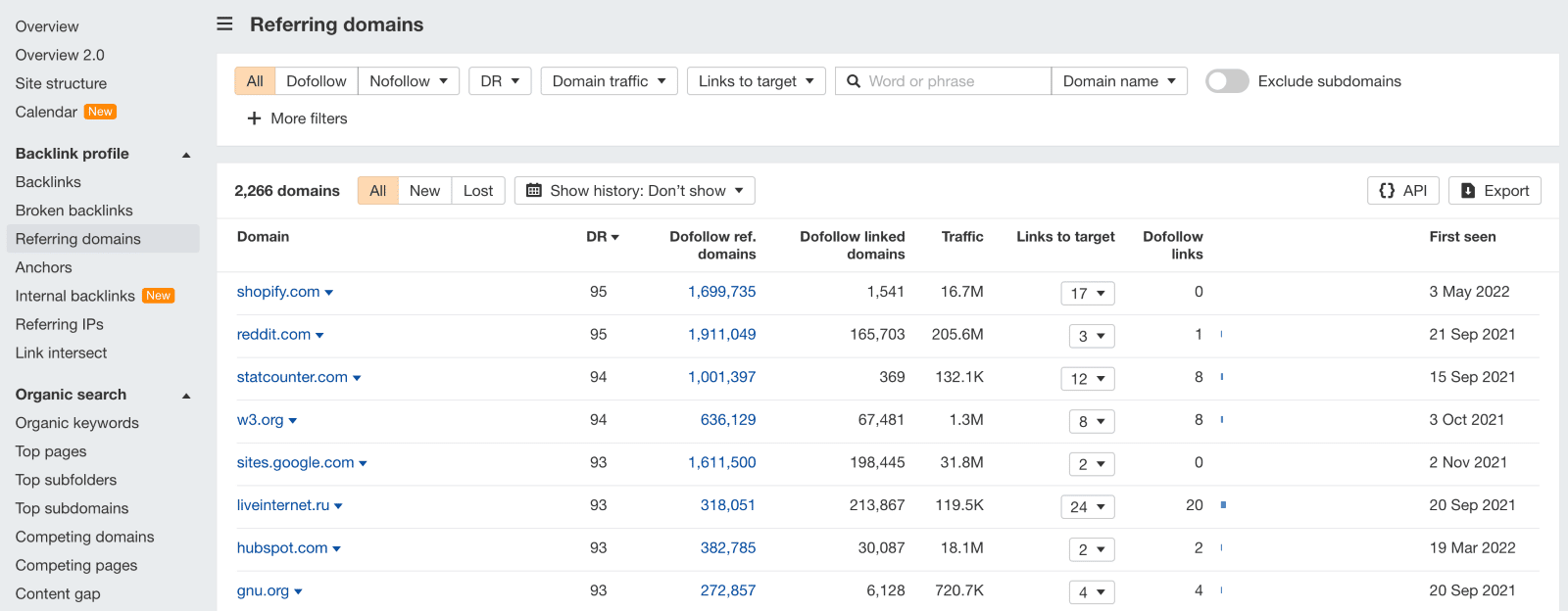 Step #2: To see the linking domains you can check the referral links and the backlinks as well. Simply click on backlinks or referring domains under Backlink Profile and you’ll see all the connecting backlinks and referring domains.