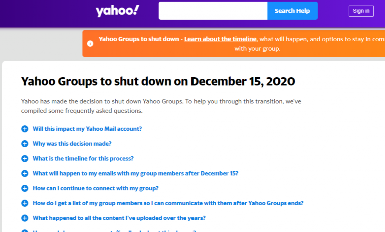 On December 15th 2020, Yahoo Group users will have to say goodbye to the online discussion platform for good. Verizon, which bought Yahoo in 2017, announced that the online platform would shut down using a two-phase procedure. The first phase began in October 2019 when users were first informed that they would no longer be able to upload any new content to the site and that existing content, which was still viewable and downloadable, would eventually be deleted. This content included photos, files polls and message history. In December 2019, the company announced that users would no longer be able to view old content and had until January 2020 to download any data they wanted to save. After the content was deleted, users were able to only browse group directory, request invitations, and send messages to groups of which they were a member.