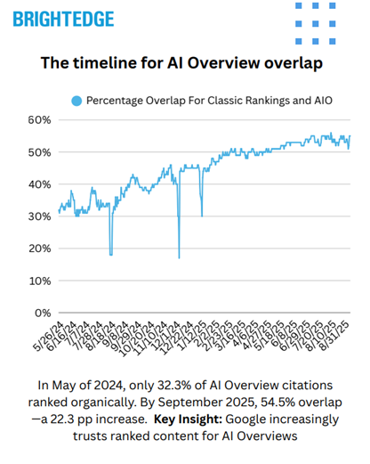 More importantly, recent studies have made it clear that rankings-based SEO may be more relevant than we thought. BrightEdge tracked overlaps between traditional Google rankings and AI Overviews over 16 months and found that overlaps were going up, not down.